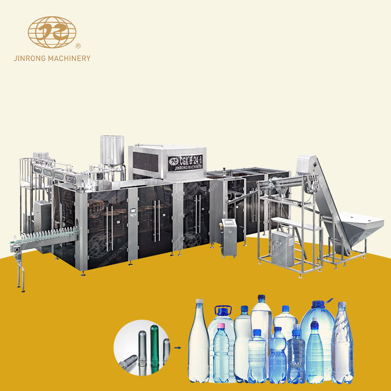 金榮機械吹灌旋一體機適用于純凈水,飲用水,礦泉水,果汁飲料,碳酸飲料等的吹瓶、灌裝、封蓋的需求。吹灌封一體機可灌裝12000-36000瓶/小時。吹灌旋一體機具有結構緊湊、控制系統完善、操作方便、自動化程度高等特點。