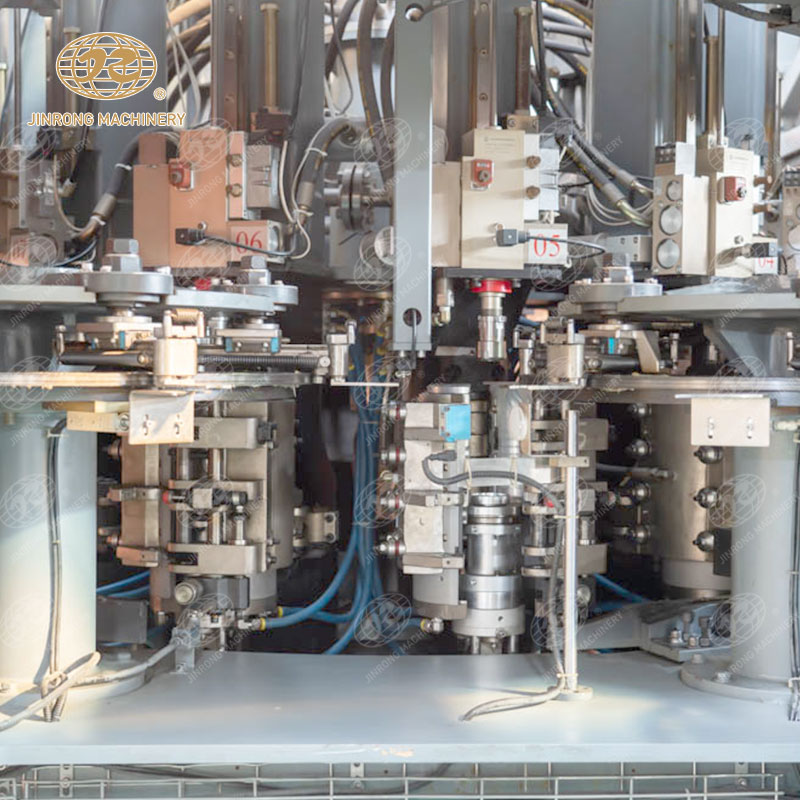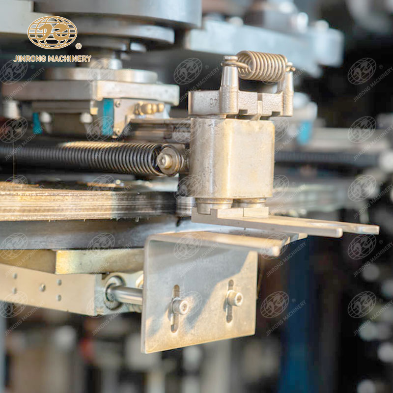 全自動旋轉式吹瓶機,有進坯斗、上料機構、 理坯機構、下料機構、進坯盤、加熱器、出坯盤組成的加熱系統,由合模機構、拉伸氣缸、封口氣缸組成的拉吹機。吹瓶設備特征在于所述的加熱系統和拉吹機安裝在同一臺機座上,電箱安裝在機座內的右后角,進坯斗、上料機構、 理坯機構、下料機構安置在電箱和加熱器之間。拉吹機是四個工位,在四個工位的拉吹機旁安裝一個取坯夾手機構和一個取瓶夾手機構,在取坯夾手機構和取瓶夾手機構中分別有兩個取坯機械手和兩個取瓶機械手。實用新型旋轉式吹瓶機,布局非常緊湊,節約了占用空間,縮短了傳遞間距,大大降低成本,并且整機為一整體,吊裝、運輸時無需拆分。